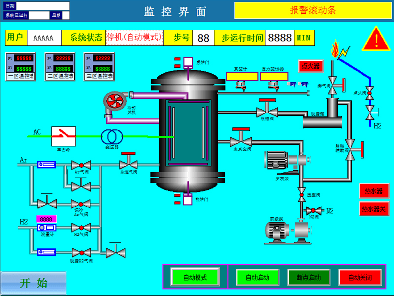 通過我們公司的系統(tǒng)可以時時監(jiān)控水壓、電壓、氣壓。能按工藝自動完成生產(chǎn)。有效的節(jié)省人力、物力等方面的成本。提高了產(chǎn)品的合格率。為公司創(chuàng)造更大的利潤。我們的軟件廣泛用于高真空釬焊爐、石墨化爐、碳化爐、TP爐、熔煉爐、碳化硅燒結爐、金屬鉭片爐、鎢絲高溫真空爐、藍鎢爐等
